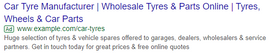 When it comes to writing effective ad copy for a B2B audience, try to focus on relevance rather than superficial performance. With most ad copy, you’ll optimise your ads to get the highest CTRs and traffic, and use these metrics as an indicator of success. Instead, take a slightly more nuanced approach when writing ads in a professional context, and ensure (principally) that you use language that will resonate with a B2B audience. Let’s take our tyre manufacturer example again, and look at a couple of sample search ads: Ad A