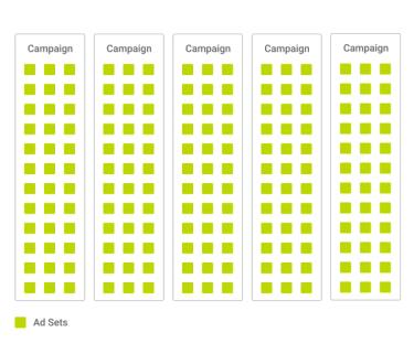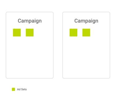 A fairly typical Facebook account structure can often look something like this - with multiple campaigns organised into different marketing approaches, strategies, or tactics. These campaigns will then be subdivided by highly-defined, narrow audiences at ad set level.