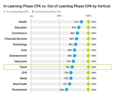 Facebook’s learning phase is the period of time that the delivery system explores the best way to deliver your ad sets after launch. This means that performance is less stable, and CPAs will actually be worse during this time because the engine is still working out the best people and places to show the ad. Anything that you can do to exit the learning phase earlier will therefore help to improve overall campaign performance. The effect will also differ by sector, as illustrated by Facebook’s own data: